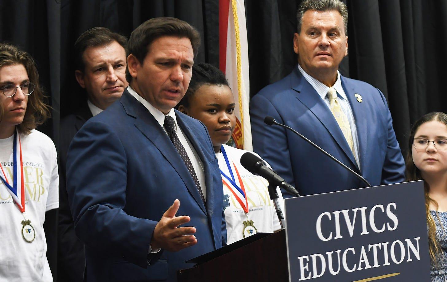 Florida Governor Ron DeSantis speaks at a press conference to discuss Florida’s civics education initiative of unbiased history teachings at Crooms Academy of Information Technology in Sanford. Photo by Paul Hennessy/via Getty Images)