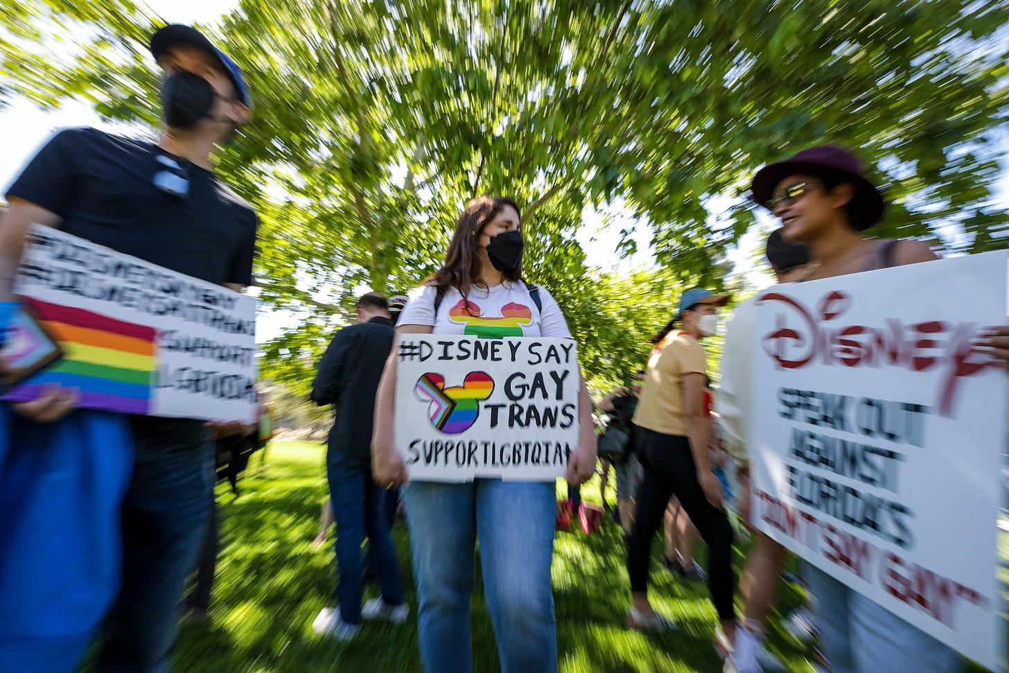 Disney LGBTQ employees rally against their CEO Bob Chapek’s handling of the staff controversy over Florida’s “Don’t Say Gay” bill at Bette Davis Picnic Area on Tuesday, March 22, 2022, in Glendale, CA. (Irfan Khan/via Getty Images)