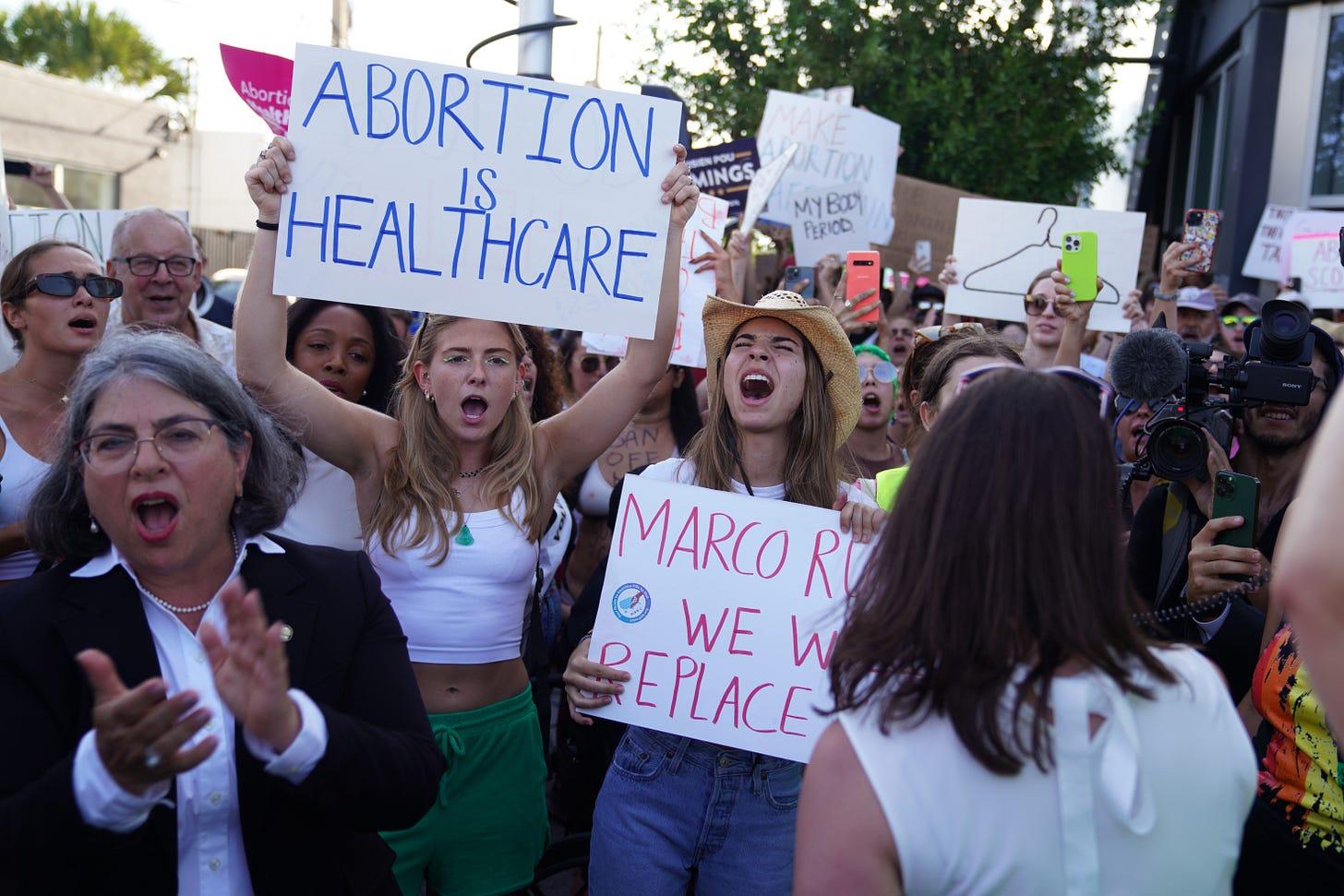 Miami-Dade Mayor Daniella Levine Cava joins with people to protest the Supreme Court’s decision in the Dobbs v Jackson Women’s Health case on June 24, 2022, in Miami, Florida. (Photo by Allison Dinner/via Getty Images)