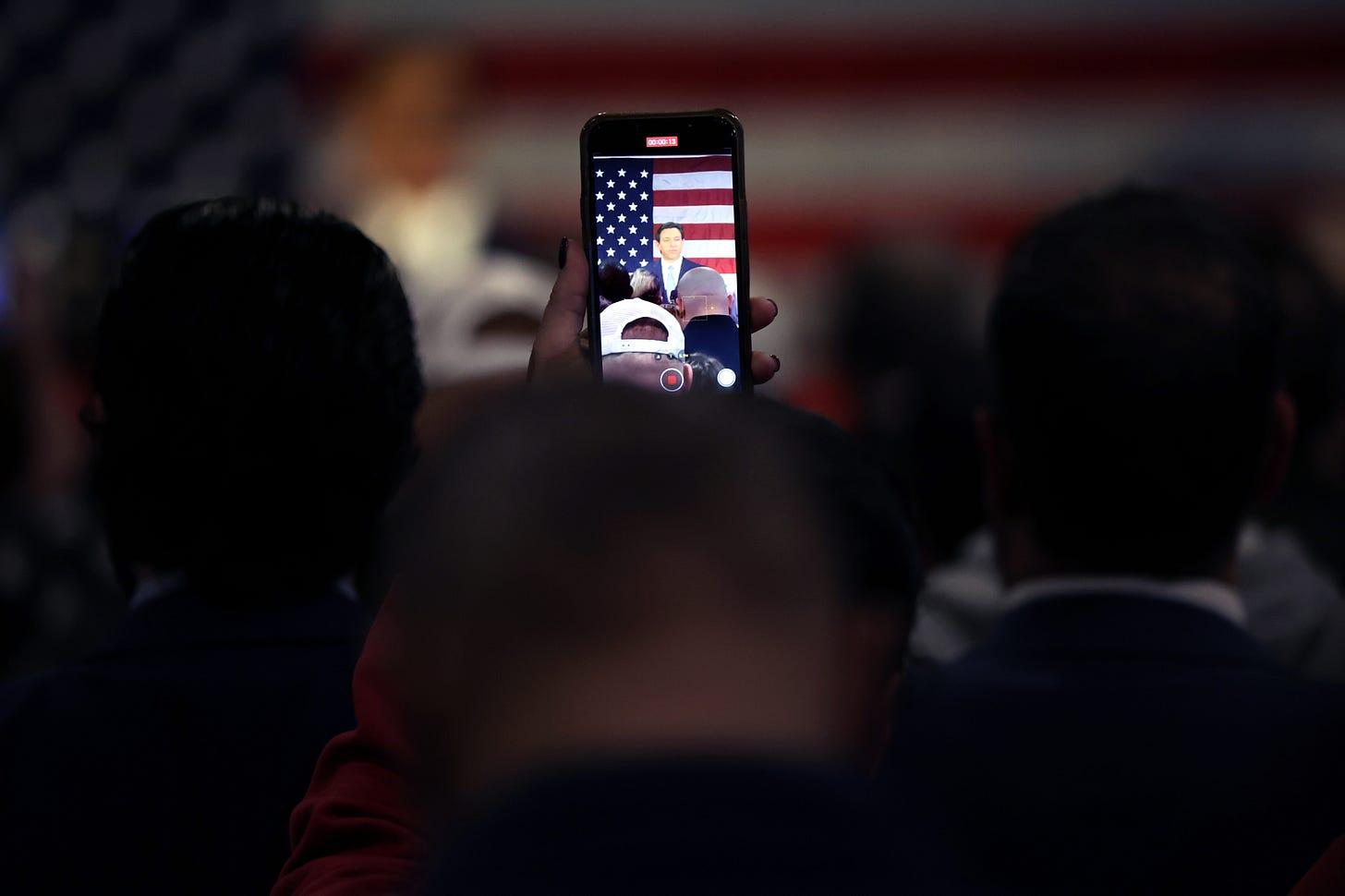 A person records on their phone as Florida Gov. Ron DeSantis speaks to police officers about protecting law and order on February 20, 2023, in the Staten Island borough of New York City. DeSantis, a Republican, is expected by many to announce his candidacy for president in the coming weeks or months. (Photo by Spencer Platt/via Getty Images)