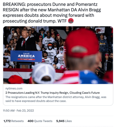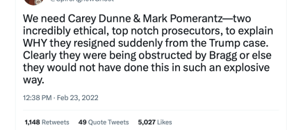 February 23, 2022, Mark Pomerantz resigned from the Manhattan District Attorney’s Office in a huff. According to headlines and reporting, “Prosecutors in Trump probe quit after new DA [Bragg] seems to abandon the plan to seek an indictment of the former president.”