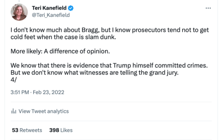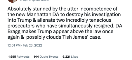 The plot thickened when senior officials in the DA’s office came to believe Pomerantz had selectively and misleadingly leaked information to the press, including his resignation letter, in order to damage Bragg. (Leaking stuff to the press during an ongoing investigation is a firing offense. Leaking stuff to the press after leaving a DA’s office where the person was privy to details about an investigation is potentially damaging to the investigation and unethical.)