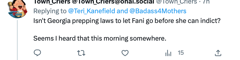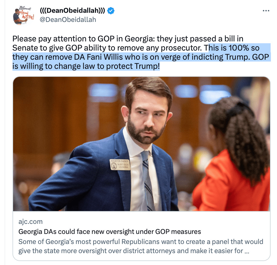 Now, let’s look at the hot takes that this legislation is “100% so they can remove Fani Willis, who is on the verge of indicting Trump.”