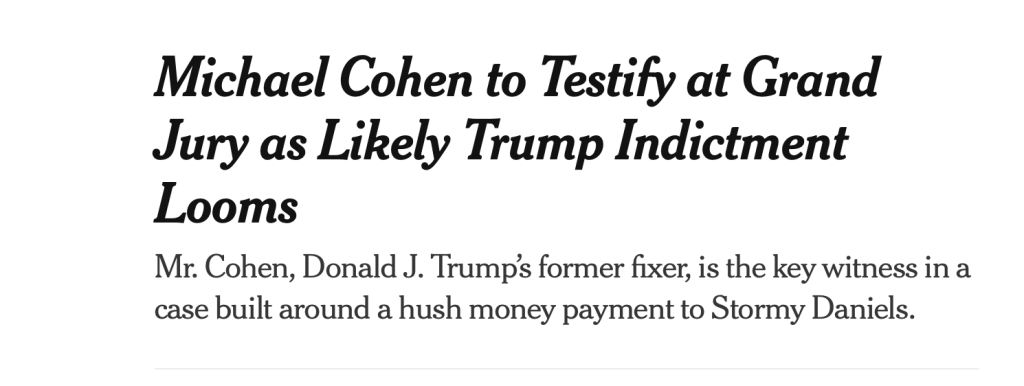 Cohen is the last of the six witnesses identified as having information about the illegal Stormy Daniels payment. Presumably, Trump (if he opted to talk to the grand jury) would do so after Cohen testified. After that, we can expect Bragg to make a charging decision.