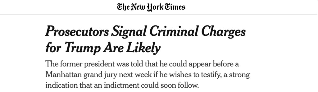 According to the article (which I can offer free through my subscription if you click here), Trump has been invited to testify before a New York grand jury which is “a strong indication that an indictment could follow.”
